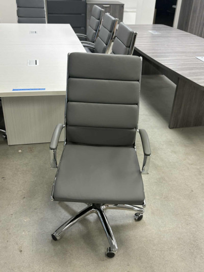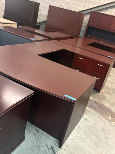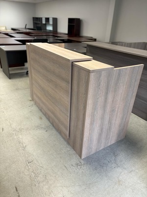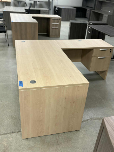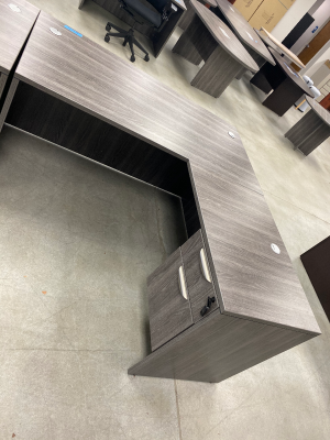 Ryker series Aged Oak color curved L shaped desk with step front modesty panel. $950. Available in this color and grey